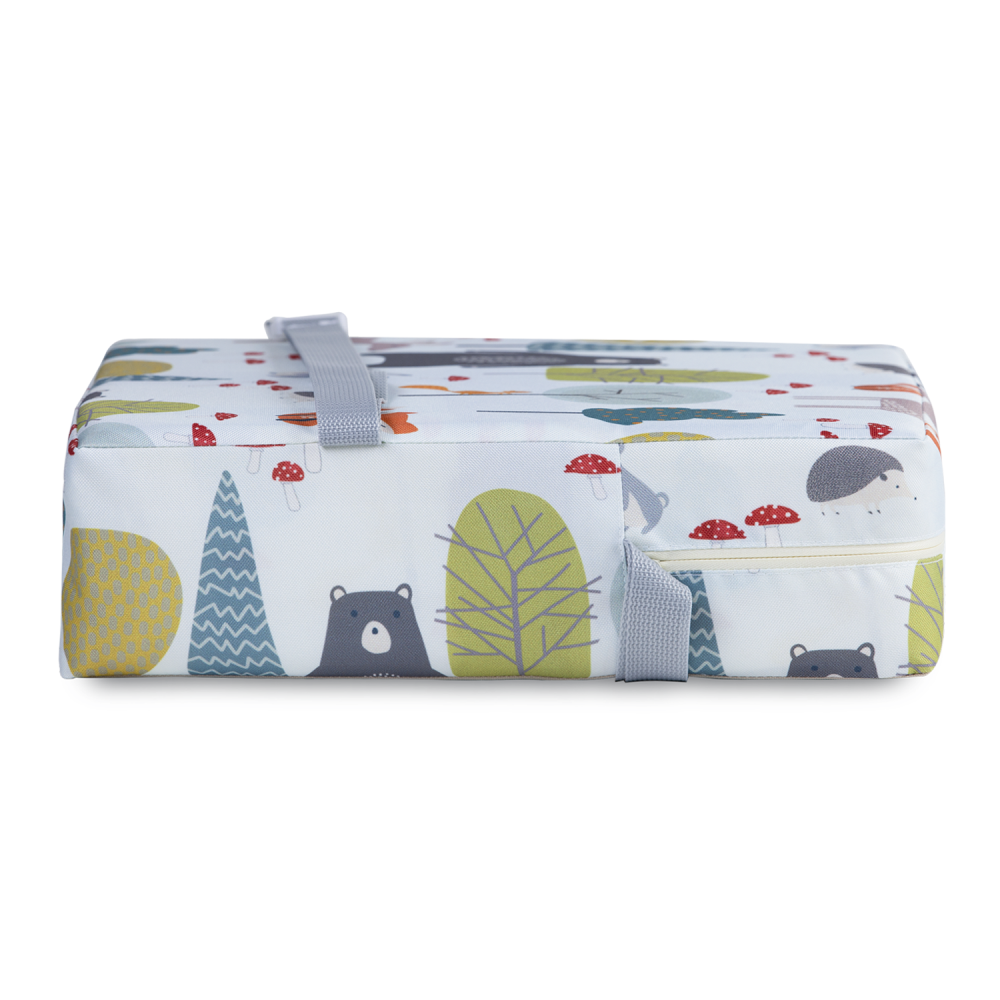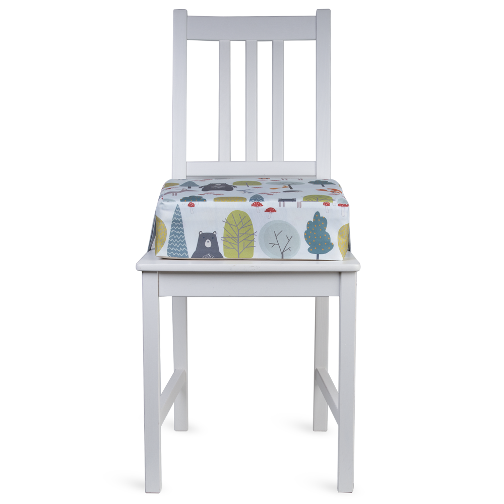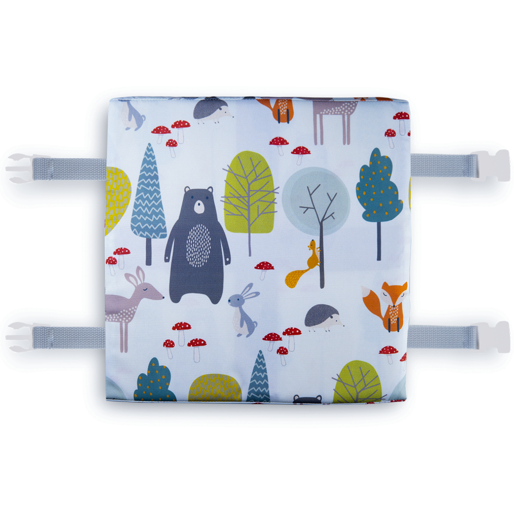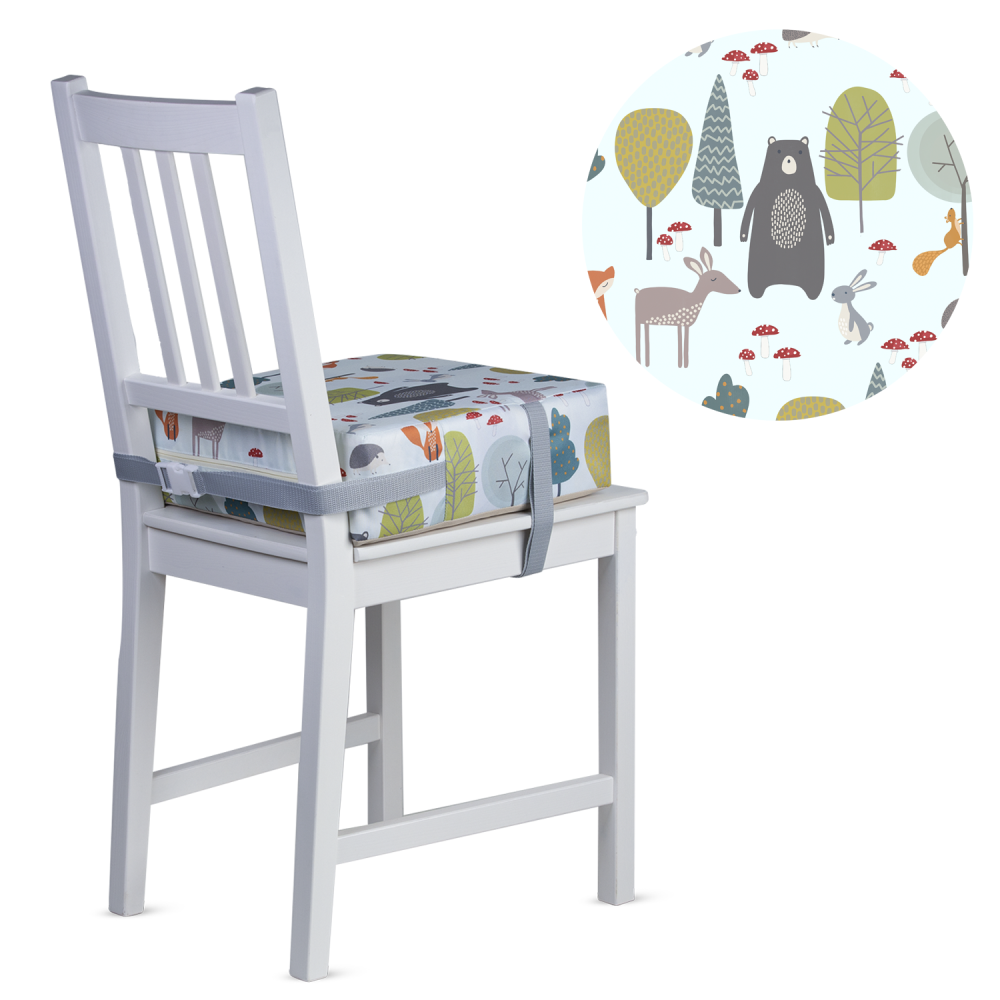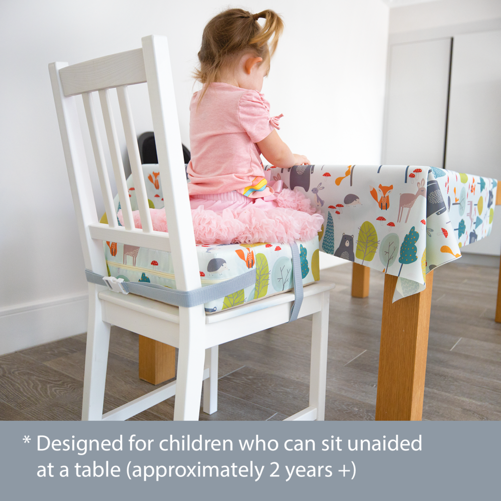 Celina Digby Designer Children’s Water and Stain Resistant Booster Seat with Straps for Dining Chair Safety.  Animal themed design with cute forest friends.