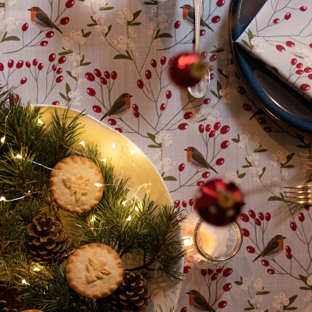 Luxury Christmas Linen-Like Tablecloth – Robin & Berries Grey – Available in 9 Sizes