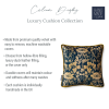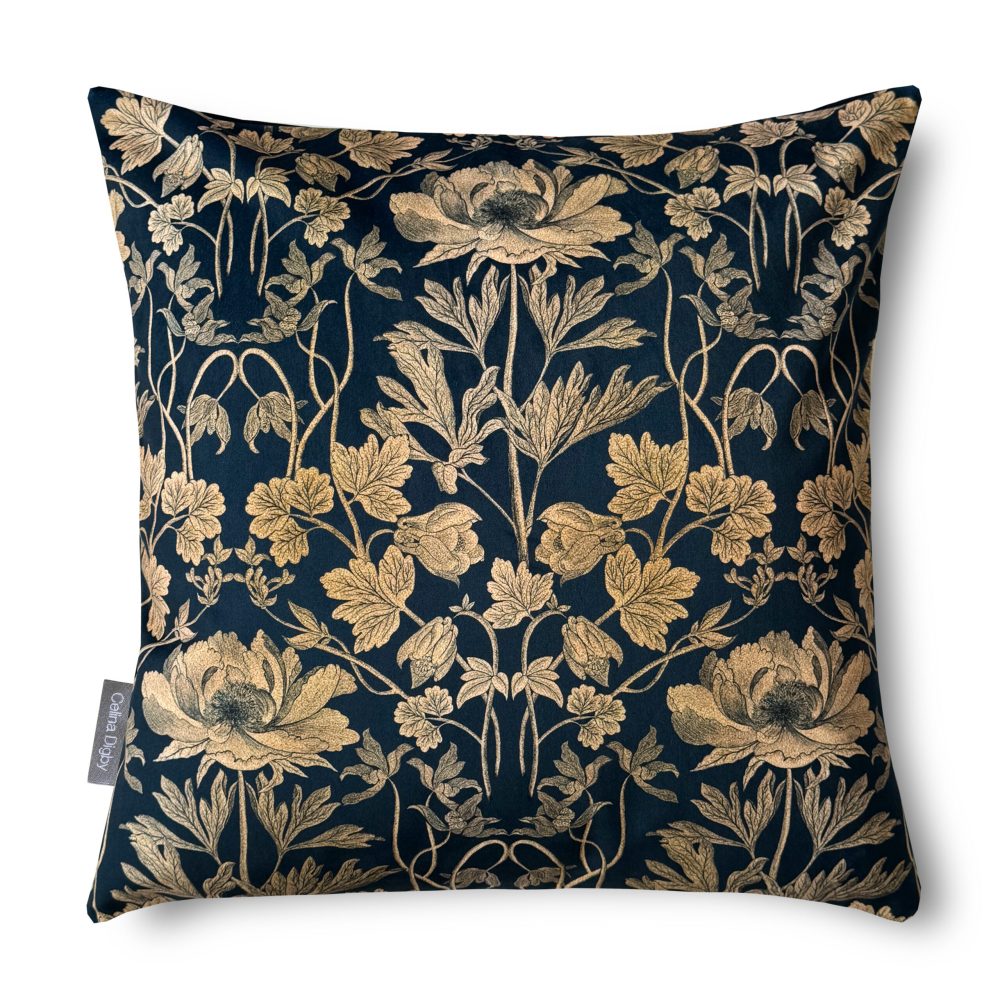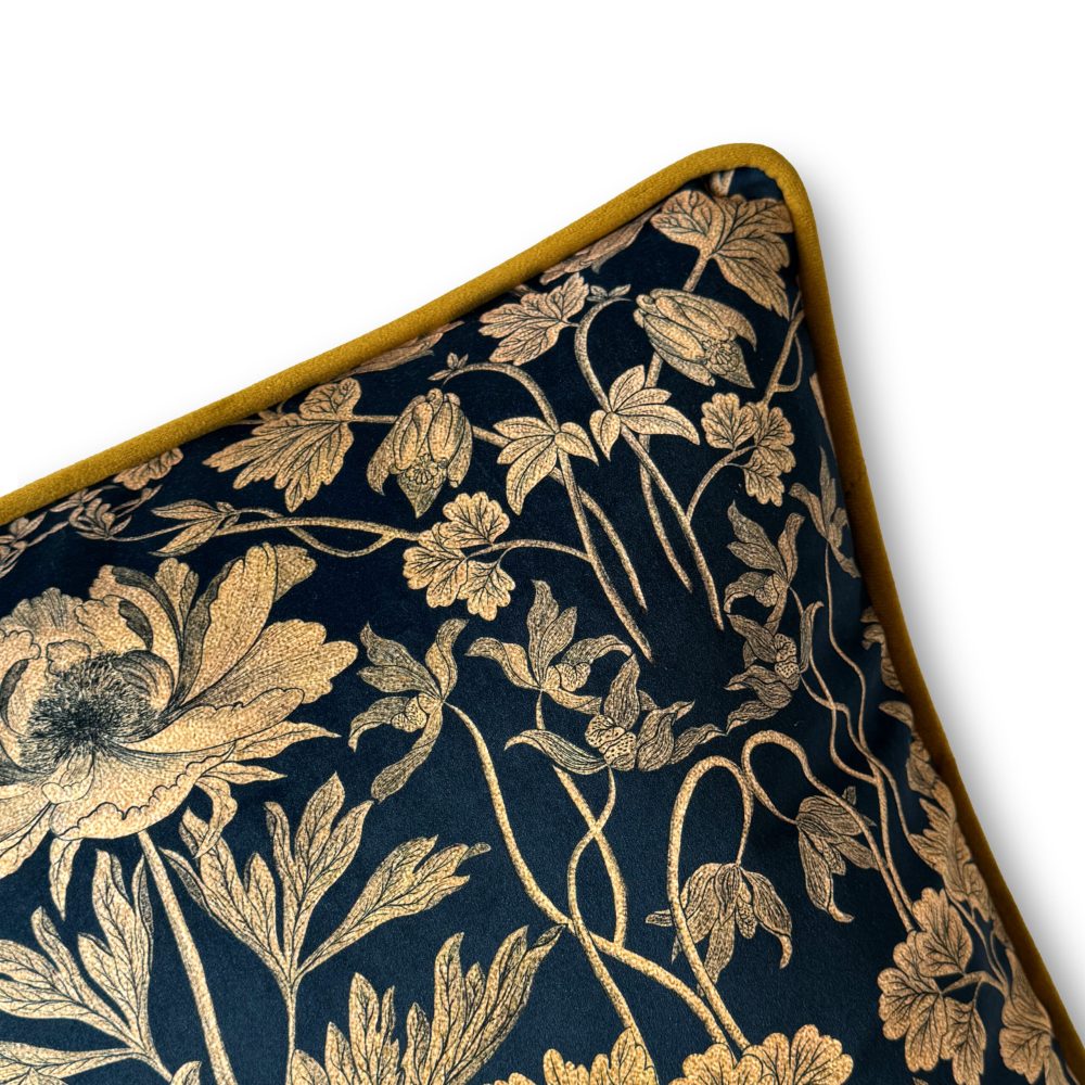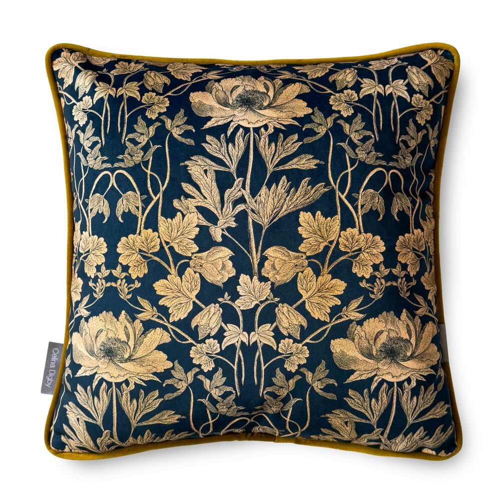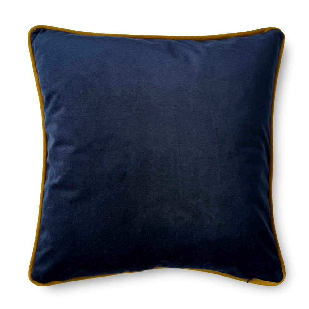 The front of the cushion is your chosen design, and the rear is heavyweight velvet in Navy Blue, chosen to perfectly compliment the design on the front of the cushion. The piping is Gold, looking beautiful against the blue and gold of the design on the front of the cushion.