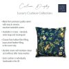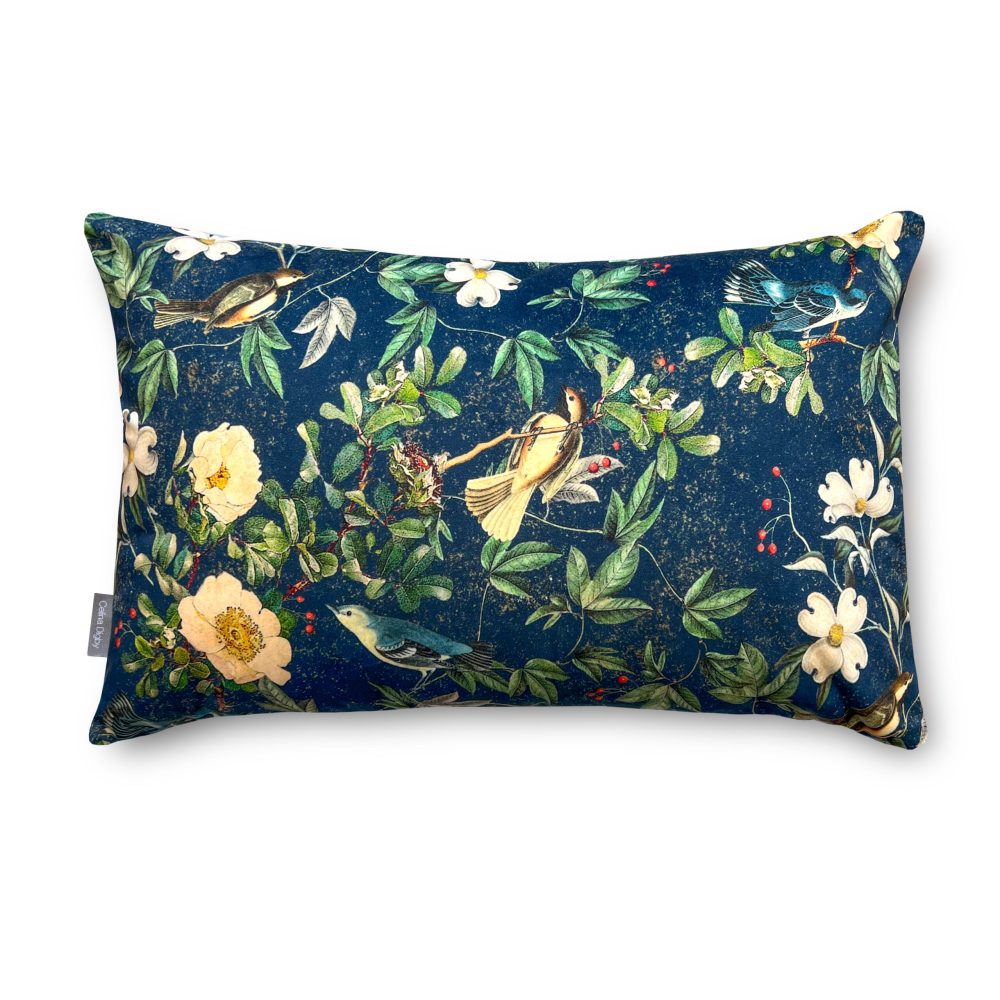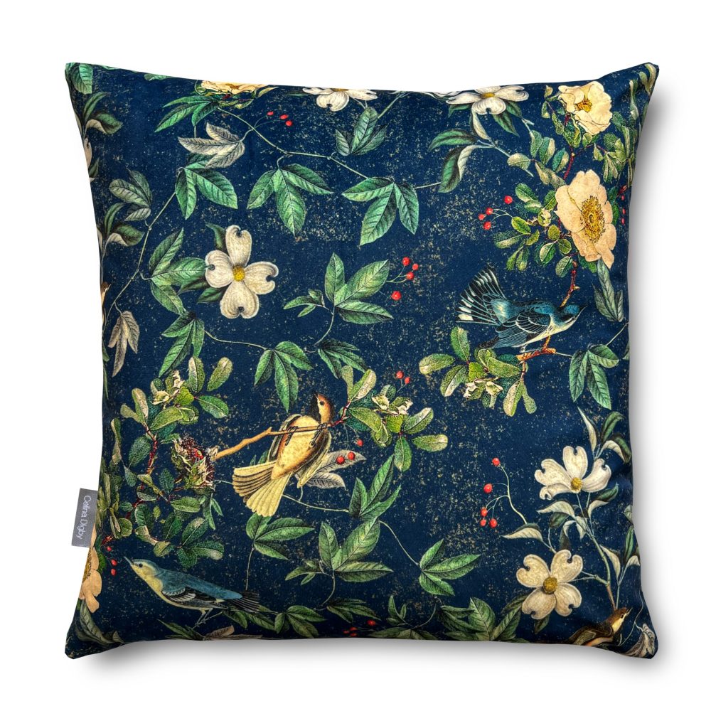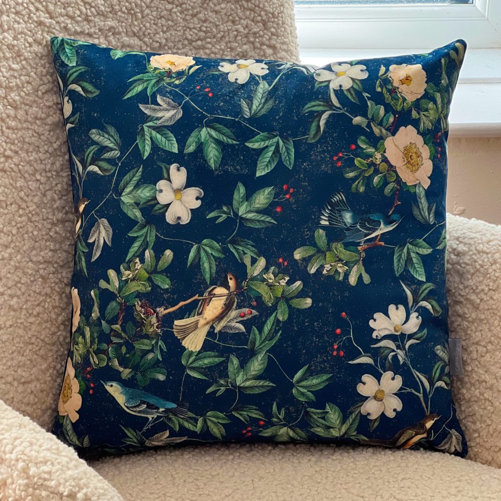 Celina Digby® Luxury Super Soft Cushion with premium quality velvet cover and generous filling – Wild Rose Pacific Blue, with birds & floral design
