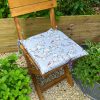 SIZE : Available in 3 sizes – 36cm x 36cm (14″x14″), 42cm x 42cm (16.5″x16.5″) and 46cm x 46cm (18″x18″) : Suitable for most square chairs and have useful ties at the back corners to keep them in place on windy days!  The foam padding is 3.75cm deep.