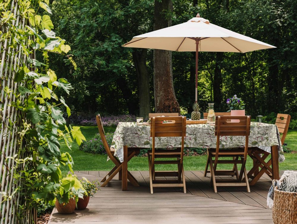We love our new tablecloth for our table that we have on our balcony. It has already protected our teak table through several summer storms. Any water just beads up and is easily wiped away, making it a great cover for outdoor use.